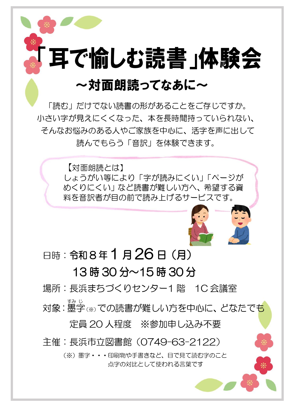 ●対象:目が見えづらい、ページをめくれないなど、本をそのままの形で読むことが難しい人を中心に、一般の方どなたでも